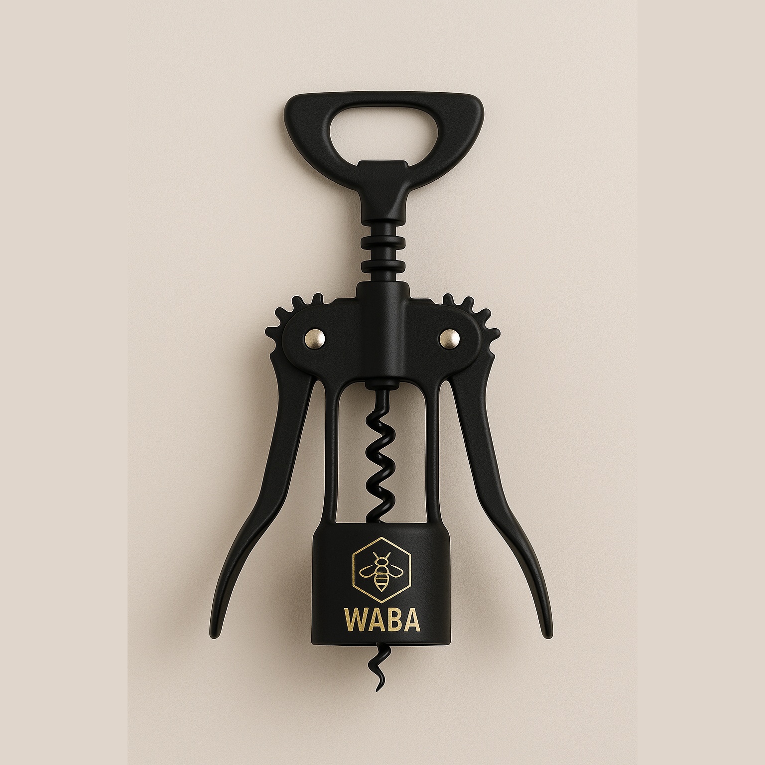 Der WABA Korkenzieher ist das ideale Werkzeug für alle Weinliebhaber und Fans unserer Marke. Gefertigt aus robustem Metall und ausgestattet mit einem klassischen Doppelhebel-Mechanismus ermöglicht er ein besonders leichtes und sauberes Entkorken jeder Weinflasche. Das schwarze, matte Finish verleiht ihm eine elegante Optik, während das dezent platzierte WABA-Logo für einen stilvollen Markenakzent sorgt.